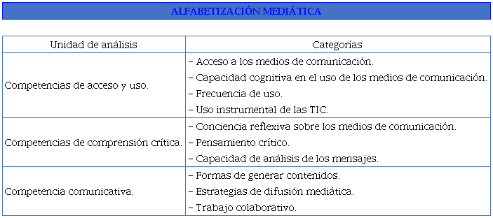 A continuación, las unidades de análisis y sus categorías, según los ámbitos de este estudio: Alfabetización mediática y comunicación intercultural.