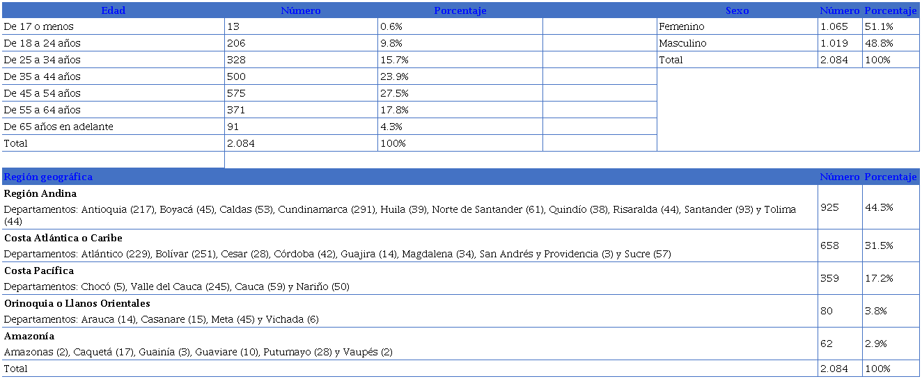 Como se indicó, participaron en total 2.084 personas con acceso a internet y residentes en alguna de las cinco regiones geográficas de Colombia, distribuidos así: