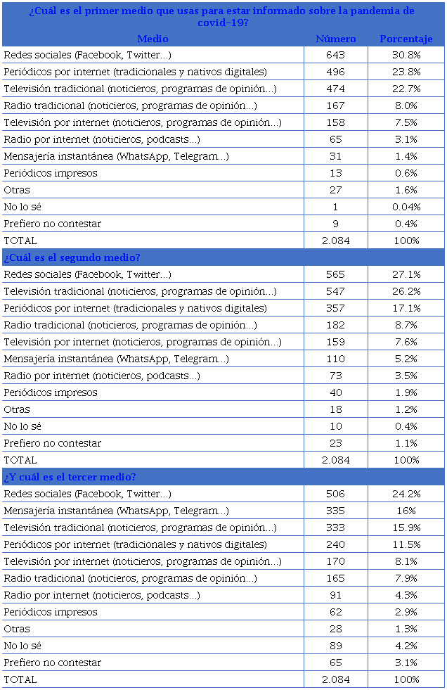 En la Tabla 2 se aprecian varios hallazgos. En primera instancia, las redes sociales digitales (Fa- cebook, Twitter…) se ubicaron de primeras, 30.8%, 27.1% y 24.2%, por encima de los medios noticiosos. Estas no son productoras de información de actualidad sino plataformas distribuidoras de información, incluyendo las noticias de los medios de comunicación internacionales, nacionales, regionales y locales. Dado que el consumo se dio en confinamiento, queda en evidencia que las mismas, además de fuente de entretenimiento, también fueron la principal fuente de información sobre la pandemia.