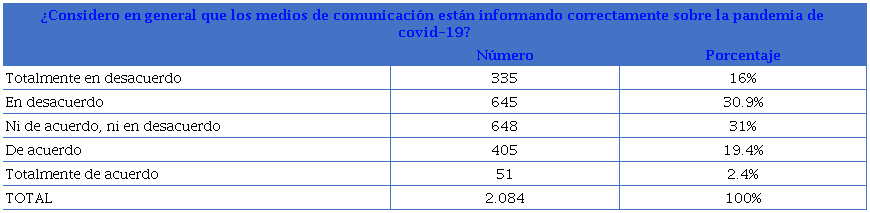 Posterior a esto, a las audiencias se les preguntó, como una forma de sondear la confianza en estos, si consideraban que los medios de comunicación estaban informando correctamente sobre la pan- demia de covid-19: