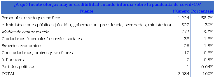 Seguidamente, a las audiencias se les preguntó a cuál fuente le otorgaban mayor credibilidad cuan- do se informaban sobre la pandemia: