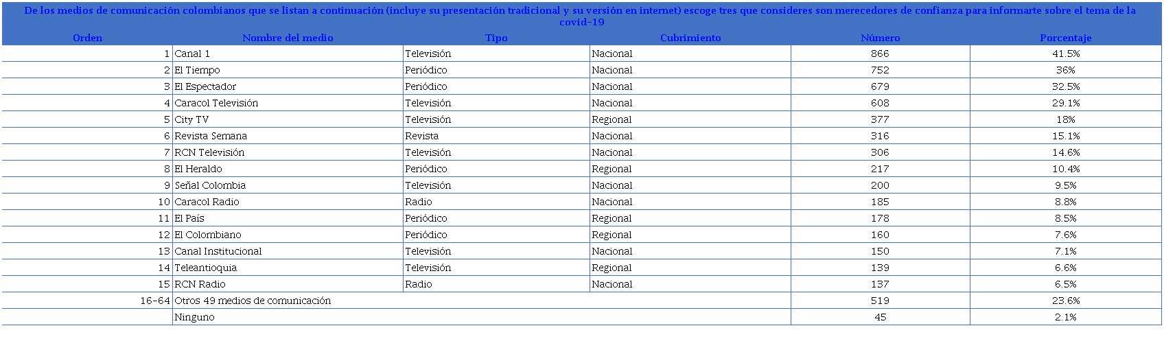 A medida que la lista desciende, aparecieron medios de cubrimiento regional y local como Tele- pacífico (televisión) 4.3%, Vanguardia Liberal (periódico) 2.5% o Emisora Atlántico (0.04%); así como medios nativos digitales, como por ejemplo, Las 2 Orillas (prensa digital) 0.2% o La Retórica CTG (televisión) 0.04%. Finalmente, un 2.1% (45) manifestó que ningún medio de comunicación colombiano era merecedor de confianza para informarse sobre la covid-19.