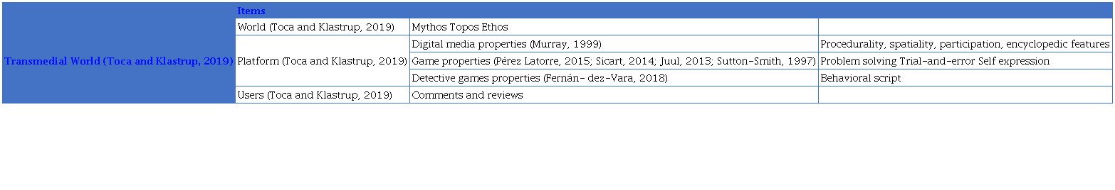 After this phase, we proceeded to analyse the material according to a series of items arising from our first observations and experiences with the Blacksad universe and the literature review. Since this research aims at detecting the connections between the graphic novel saga and the videogame, the items of the analysis were built upon the three pillars of TMW proposed by Tosca and Klastrup (2019), namely world, platform, and users. These pillars were complemented with additional items to assess both the specific features of the Blacksad universe (detective fiction features) and the affordances of video games as platforms (since one of the specific goals of this research is to assess the possibilities of video games to contribute to generate experiences in the transmedia ecology). These items are explained below and summarized in Table 1.