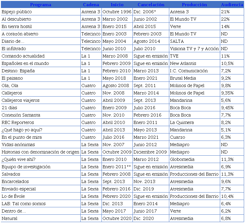 La mayoría de estos programas de reportajes no son producidos desde los servicios informativos de las cadenas generalistas sino por productoras externas, mediante sus propios equipos de periodistas, cámaras, realizadores, guionistas y productores. Solo seis de los 29 programas analizados son de producción propia: Comando Actualidad (TVE), Espejo Público (Antena 3), Equipo de Investigación, Encarcelados, Enviado Especial y Natural (Atresmedia). Entre las 16 productoras responsables de estos espacios, destacan Producciones del Barrio, Mandarina, Molinos de Papel, Mediapro y Boca Boca.
