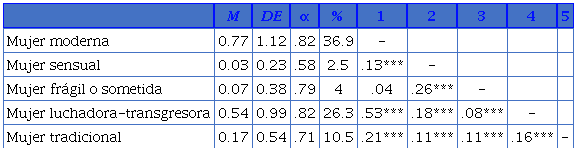 = 1.12) y de mujer luchadora-transgresora (M = 0.54, DE = 0.99), los cuales tendieron además a presentarse en conjunto en la mayoría de las ocasiones, r(2083) = .53, p < .001. Por su parte, los estereotipos de mujer tradicional (M = 0.17, DE = 0.54), mujer frágil o sometida (M = 0.07, DE = 0.38) y mujer sensual (M = 0.03, DE = 0.23) presentaron una utilización casi residual dentro de los spots analizados. En este caso, la correlación mayor se presentó entre los estereotipos de mujer sensual y mujer frágil o sometida, r(2083) = .26, p < .001, los que tendieron a presentarse en conjunto en los comerciales estudiados. A pesar de estos datos, cabe mencionar que el uso de los estereotipos descritos tendió a ser reducido, toda vez que ninguno de ellos presentó una puntuación superior a la media teórica (M = 1.5).