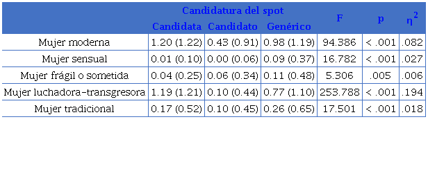 .001, η2 = .194, que también tuvo mayor presencia en los spots de candidatas (M = 1.19, DE = 1.21) que en los genéricos (M = 0.77, DE = 1.10) o los de candidatos (M = 0.10, DE = 0.44).
