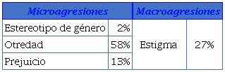 Como se ve en la Tabla 3, el tipo de agresión más frecuente es la otredad, entendida como una microagresión, que instaura una condición irreal de diferencia, creada culturalmente y que marca una subvaloración y opresión sobre un grupo determinado, en este caso, las mujeres. Inmediatamente después se encuentran las agresiones tipo estigma, al que aludimos como un atributo profundamente desacreditador de acuerdo con la connotación social que se le atribuya y el contexto social en que se encuentre (Vidal Pollarolo, 2018). El tipo de agresión evidenciado como menos frecuente es el estereotipo de género, en el que se asigna un atributo a una mujer por el solo hecho de serlo, como resultado de una generalización cultural tradicional.
