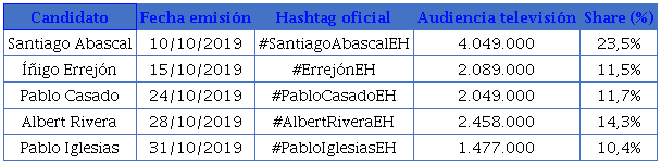 El análisis empírico de la conversación social generada a partir de las apariciones públicas de cinco líderes políticos -Pablo Iglesias (Unidas Podemos), Pablo Casado (PP), Albert Rivera (Ciudadanos), Santiago Abascal (VOX) e Iñigo Errejón (Más País) - en el mismo programa de infoentretenimiento político, El Hormiguero, durante la campaña electoral de 2019 en España nos ha permitido identificar algunos resultados interesantes al respecto.