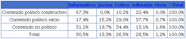 En cuanto a la relación entre el tipo de contenido y el tipo de información que se trate, en función de si puede ser considerada una información blanda (soft news) o información dura (hard news), también pudo observarse una relación significativa entre estas variables (Chi-square ≤.054). Como era de esperar, los contenidos políticos constructivos se asociaban claramente con noticias duras (81,6%), mientras que los contenidos políticos vacíos se asociaron, por el contrario, con noticias blandas (97,1%). Algo similar se observó con los contenidos no políticos, al vincularse en su mayoría con noticias blandas (96,7%).