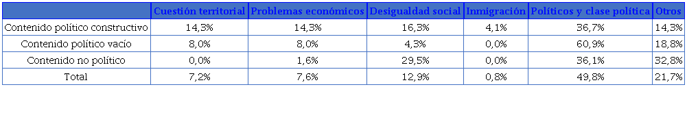 Finalmente, el análisis de estas asociaciones entre los diferentes tipos de contenido se completa con su vinculación con los temas de los que tratan los tuits, un cruce que también resultó estadísticamente significativo (Chi-square ≤.000). Como se refleja en la tabla 3, los tuits de contenido político vacío se concentraron en temas vinculados con la clase política y los políticos en buena medida (60,9%). Aquellos contenidos políticos de naturaleza constructiva, si bien diversificaron más su temática, también se caracterizaron con temas vinculados con la clase política (36,7%).