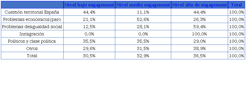 ≤.013). Algunos temas como los problemas de desigualdad social o la inmigración obtuvieron niveles de engagement considerablemente altos. También resultó alto el engagement de los tuits sobre la cuestión territorial de España, aunque en este caso el patrón no fue tan claro. Los tuits sobre los políticos y la clase política, por su parte, si bien fueron los más numerosos, se circunscribieron en un 70% de los casos a un nivel de engagement medio o bajo, como se observa en la tabla 5.