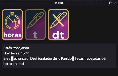 Siguiendo la dinámica de la sala, interactuábamos con los comandos gamificados del canal cada vez que uno de estos bloques comenzaba (comando “t”) o concluía (comando “dt”). Los comandos sólo estaban activos durante unos minutos en el arranque y final de cada bloque, por lo que resultaba preciso estar pendiente de la emisión para no perder la oportunidad de ejecutar la acción (algo que ocurrió en contadas ocasiones). Como muestra la Figura 2, a octubre de 2020 la aplicación interna del canal, QRobot, que es quien controlaba los comandos gamificados del canal, nos otorgaba un cómputo global de 53 horas trabajadas y un nivel de usuario advanced dentro de la sala.