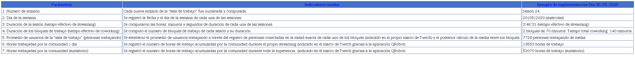 Durante el tramo que duró esta fase del trabajo de campo, desde el 13 de mayo hasta el 30 de junio, asistimos de manera directa a 32 sesiones de la sala de trabajo, sumando un total de 112 horas, 13 minutos y 16 segundos de tiempo de streaming, de los cuales 67 horas y 40 minutos correspondieron a tiempo efectivo de “bloques de trabajo”.