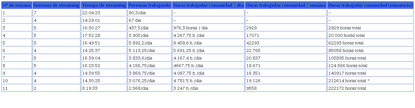 Respecto al cómputo del tiempo efectivo de trabajo invertido por la comunidad, durante el período estudiado se obtuvo un promedio de 4.482,81 horas trabajadas por la comunidad cada día, y de 18.844,5 horas trabajadas por la comunidad cada semana. No obstante, el dato más revelador recae en el cómputo global de horas trabajadas por la comunidad durante las 11 semanas de experiencia, el cual asciende hasta las 222.172 horas de trabajo aportadas por los usuarios del canal de Twitch de Jaime Altozano a lo largo de las 50 sesiones de coworking comprendidas en este estudio. Un número de horas equivalente a más de 25 años de trabajo ininterrumpido. Para comprender mejor este dato, cabe mencionar el cálculo de que un ser humano que trabaje 40 horas semanales durante 45 años laborables en realidad pasa trabajando un tiempo efectivo equivalente a 12 años.