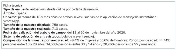 Para responder a nuestros objetivos se optó por un estudio descriptivo con finalidad exploratoria y se realizó una encuesta autoadministrada online entre los días 13 y 20 de noviembre del año 2020. El cuestionario se sometió a un pretest para garantizar la validez del instrumento del que participaron 20 estudiantes de grado y posgrado que constituyen más del 2% de la muestra diseñada. Tras los resultados óptimos de la prueba piloto comenzó el trabajo de campo. En la encuesta participaron un total de 713 personas de España mayores de 18 años que accedieron a la misma a través de una técnica de muestreo “bola de nieve” materializada en forma de cadena de difusión por la propia aplicación de WhatsApp (garantizando así que la encuesta llegaba solo a usuarios de la misma). Se optó por un muestreo innovador que permitiera estudiar el fenómeno desde dentro superando con ello los enfoques clásicos de encuesta telefónica. Con esta premisa, la encuesta se difundió inicialmente desde el teléfono de 5 investigadores del Departamento de Ciencia Política de la Universidad de Murcia. Una vez realizada la distribución inicial desde estos puntos de expansión, la muestra se conformó por reenvío masivo según los patrones de la técnica cualitativa de muestreo “bola de nieve”.