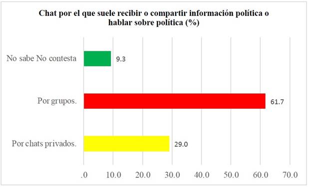 Considerando la importancia estratégica de WhatsApp, algunos autores como Valenzuela, Bachmann y Bargsted (2019) profundizaron recientemente en la investigación sobre los patrones de conversación política en servicios de mensajería instantánea móvil. Los resultados, centrados en Chile, concluyeron que el uso de la aplicación para estos fines no resultó tener diferencias significativas según “género, ingresos, ideología, exposición a noticias de radio y periódicos, y niveles de atención a las noticias”. Este carácter sumamente transversal convierte a WhatsApp en un instrumento político de masas y, por tanto, en un canal de particular interés para la comunicación política. Ahora bien, los autores sí pudieron ver una probabilidad de uso mayor de la aplicación para estos fines en aquellos encuestados “más jóvenes y educados que consumían noticias de televisión con menos frecuencia y (…) dependían más de las plataformas de redes sociales como fuente de noticias” (Valenzuela et al., 2019, p. 11).