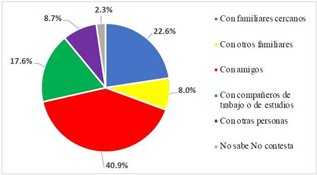 V3. Persona que suele enviar información de tipo político o con quién suele hablar más de política en WhatsApp (categorías: con familiares cercanos (madre, padre, hermanos…) /con otros familiares/con amigos/con compañeros de trabajo o de estudios/con otras personas/NS-NC).