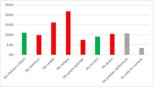Como señaló Mason (2018, p. 4), uno de los elementos definitorios de la polarización social es, junto con el prejuicio frente a los simpatizantes de los partidos contrarios, el “enfado” como emoción más extendida. A esta apreciación podríamos añadir que la negatividad emocional, no solo restringida al enfado, a la ira o a la indignación, podría ser un indicador válido de los niveles de polarización afectiva de una sociedad o de una red social. De este modo, procede preguntarnos qué emociones destacan entre nuestros encuestados cuando reciben información política o hablan de política en sus chats de WhatsApp.