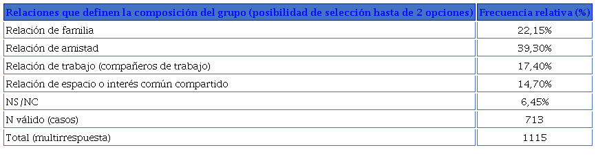 Las relaciones que definen la composición de los grupos no se ven afectadas significativamente por la edad de los entrevistados (N válido=713, χ2=12.819, p-value=0,1182) ni por su ideología (N válido=713, χ2=1.4206, p-value=0,8406), aunque sí por su sexo (N válido=713, χ2=20.22, p-value=0,0001528). De entre todas las mujeres, un 42,9% hablan en grupos familiares. Este porcentaje se reduce al 26,6% en los hombres, que hablan más que las mujeres por grupos con compañeros de trabajo (30,7%/23,6%) y por grupos de amigos (65,7%/57,1%).