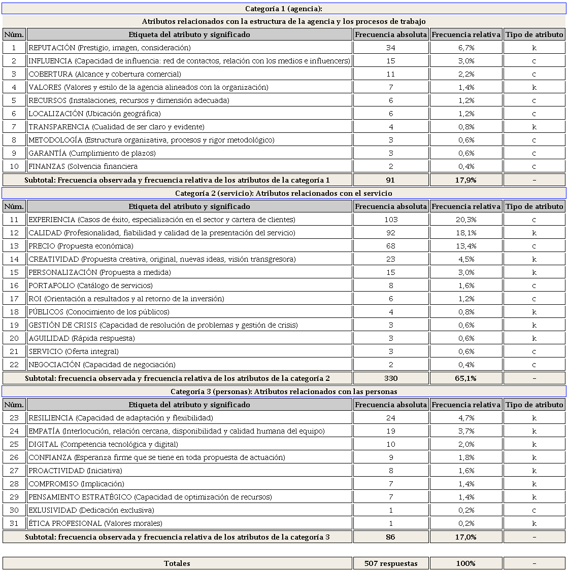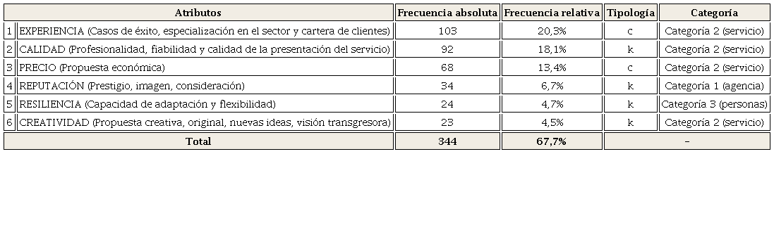 Los principales resultados se detallan a continuación en la tabla 1. En la 1ª columna se han numerado cada uno de los atributos resultantes de la investigación, y se han ordenado, de manera descendente, según su repetición en cada una de las tres (3) categorías. En la 2ª columna responde a las tres primeras preguntas del cuestionario sobre cuáles eran los tres atributos principales de selección de una agencia de relaciones públicas y comunicación, así pues, se detallan las etiquetas de estos atributos, con un breve significado de cada uno, y se han agrupado por categorías. En la 3ª se muestran las frecuencias absolutas u observadas de cada uno de los atributos y, en la 4ª, las frecuencias relativas, o porcentaje que representa cada atributo sobre el total de las 507 respuestas dadas a estas tres primeras preguntas. En la 5ª y última columna, se expone la tipología del atributo, cuantitativo