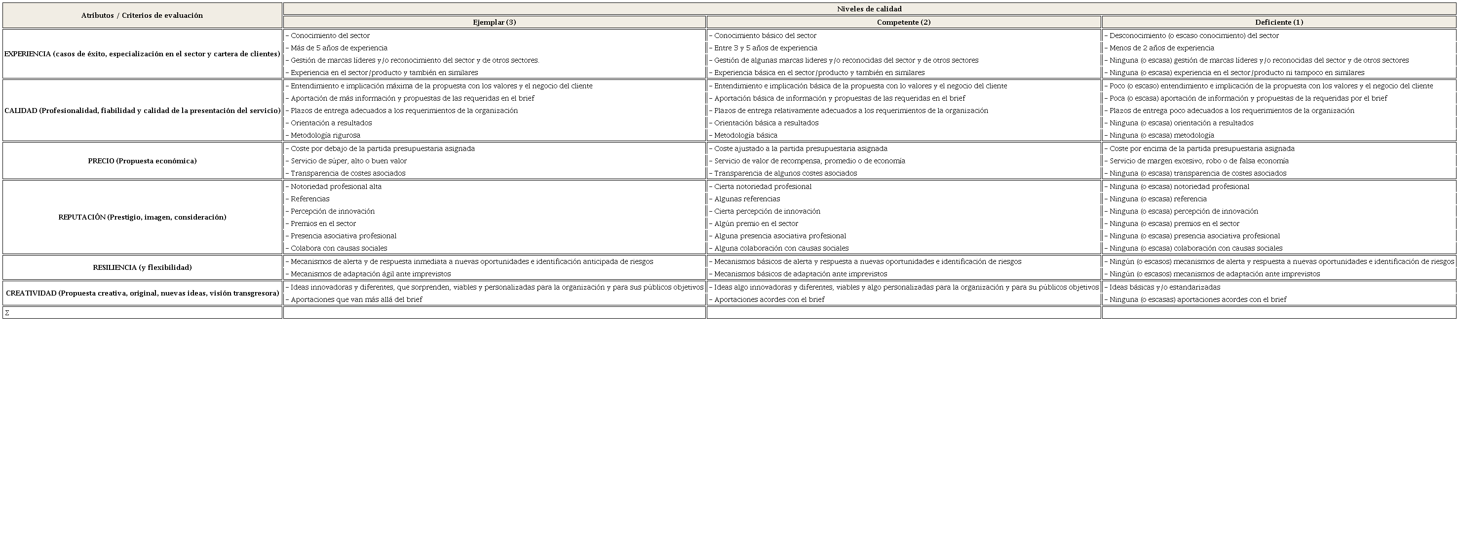El directorio de atributos puede elaborarse mediante un sondeo a expertos, identificando los atributos utilizados en selecciones anteriores parecidas, o bien mediante información de empresas de consultoría. Una vez elaborado el directorio de atributos, éstos deberán elevarse a criterios de selección mediante la definición cualitativa de cada nivel competencial, y su correspondiente puntuación cuantitativa. Cada nivel deberá describir adecuadamente qué tiene que acreditar la agencia de relaciones públicas y comunicación para alcanzar un determinado grado de perfección respecto a un atributo de evaluación (Fraile, Pardo y Panadero, 2017).