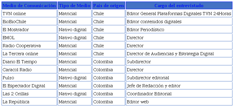 Se realizaron doce entrevistas semiestructuradas a editores y directores de medios de prensa digitales tanto de Chile como de Colombia (Ver Tabla 1). La entrevista en profundidad es una estrategia ampliamente utilizada como método de obtención de datos, ya que le permite al individuo objeto de la investigación hablar libremente sobre el tema de interés (Creswell, 2003).