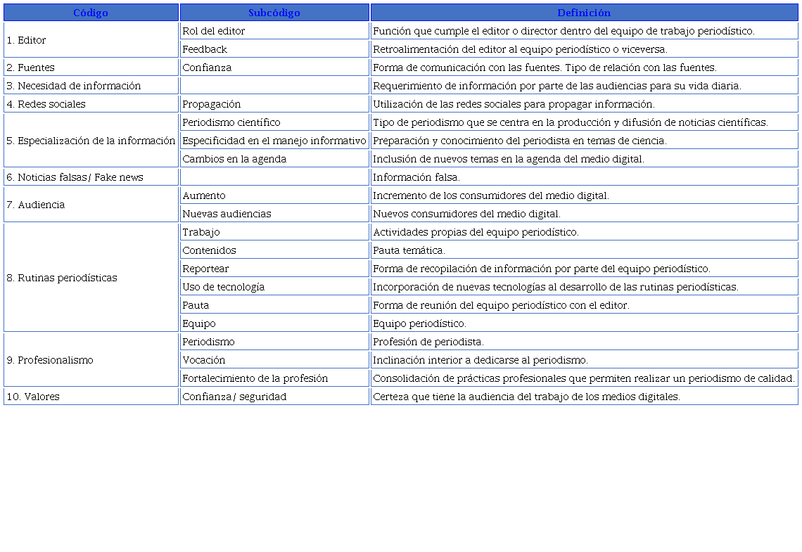 El tercer paso involucró la identificación de relaciones y patrones entre los códigos abiertos por parte de un investigador que revisó todas las entrevistas codificadas para determinar cualitativamente las diferencias y similitudes en los cambios en los medios de comunicación producidos por la pandemia.
