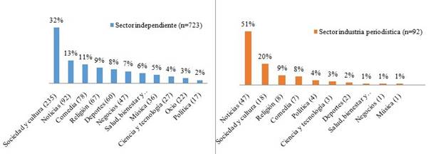 La especialización del podcasting en Puerto Rico se basa en “Sociedad y cultura”, que representa el 31% del corpus analizado (253 de 815 pódcast), y trata arte, historia, crítica de cine y educación; “Noticias” (17% o 139 pódcast) y “Comedia” (10% o 85 pódcast). Otros contenidos son religión, deportes, negocios, salud, bienestar y familia, música, ciencia y tecnología, ocio, política y crimen, que no alcanzan el 10% de presencia.