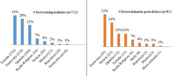 El podcasting independiente opta más por la tertulia (33% o 236 pódcast de los 723 de este sector), la entrevista (29% o 210 pódcast) y la opinión personal (22% o 160 pódcast) en ocasiones improvisada. Precisamente, seis de los nueve podcasters amateurs que publican episodios con más regularidad desarrollan sus pódcast a través de la tertulia, la entrevista o la opinión personal (véase tabla 5). En este sector, la suma de los totales de los géneros daily (1 pódcast) y mesa redonda (4 pódcast) resultan en 1%. En cambio, y al favorecer las “Noticias”, el podcasting profesional de los medios favorece la entrevista (32% o 29 pódcast de los 92 de este sector) y la noticia (24% o 22 pódcast). En los pódcast de los medios figura menos la tertulia (13% o 12 pódcast) y la opinión (13% o 12 pódcast). El gráfico 2 lo representa (Gráfico 2).