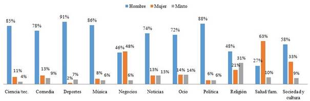 Al combinar la variable de género en la presentación y la dirección del pódcast con la variable de temática, se evidencia que, en la muestra total analizada, los pódcast de las siguientes categorías están moderados por hombres: “Ciencia y tecnología” (25 de 30 pódcast), “Comedia” (67 de 85), “Deportes” (56 de 62), “Música” (32 de 37), “Noticias” (96 de 139), “Ocio” (16 de 22), “Política”