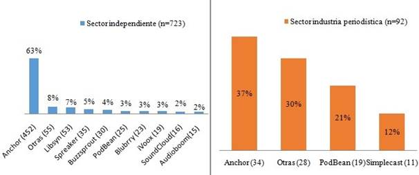 pódcast), iVoox (3% o 22 pódcast), SoundCloud (3% o 21 pódcast), Simplecast (2% o 20 pódcast) y