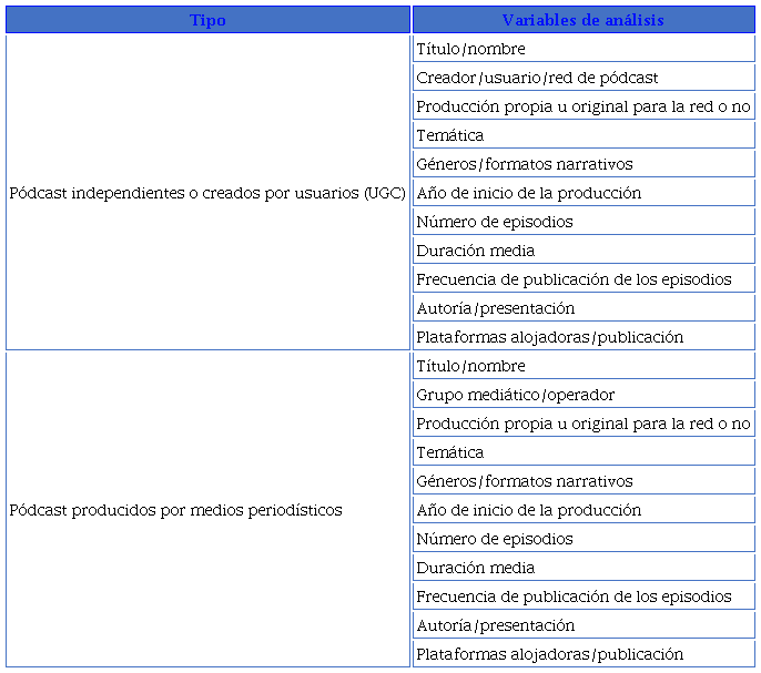 Una vez conformado el corpus o muestra (n=815), se elaboró y consolidó una base de datos en Excel entre el 2 y el 15 de mayo de 2021. Esta base de datos incluyó la catalogación de todos los pódcast previamente identificados a partir de las 11 variables de análisis que la tabla 1 expone. Se trata del título o nombre del pódcast, el creador/usuario o grupo de comunicación/operador al que pertenece, si es una producción propia u original para la red o no, temática, género o formato narrativo, año de inicio de la producción, número de episodios, duración media de los episodios, frecuencia de publicación, autoría o presentación y plataforma alojadora o de publicación del pódcast. En el caso de los pódcast de medios, se incidió en la variable de producción propia u original para la red o no ya que esta variable ayuda a decidir qué pódcast son realmente nativos.