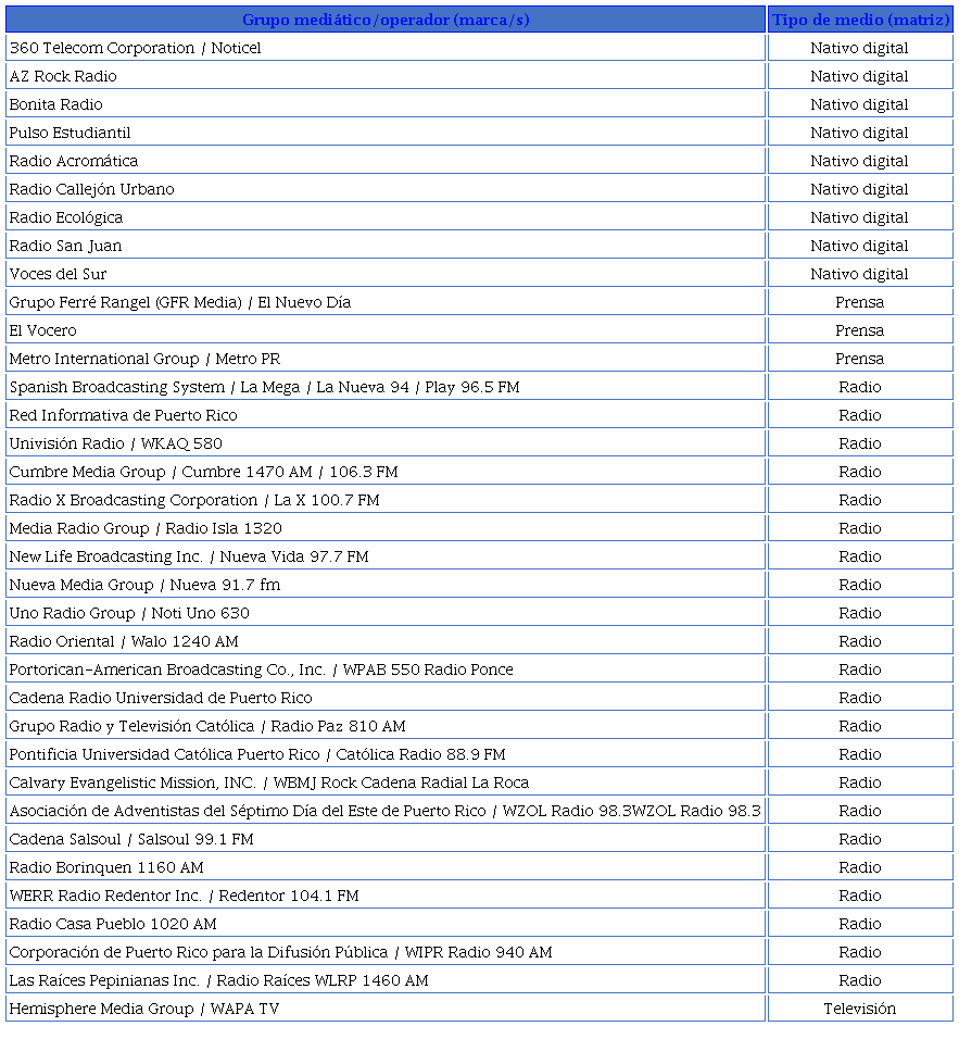 Por su parte, la industria periodística de Puerto Rico continúa apostando por el podcasting profesional ya que el 11% de la muestra evaluada (92 de los 815 pódcast) pertenece a alguno de 35 grupos de comunicación y medios. Sin embargo, se aprecia que los grupos de comunicación puertorriqueños asumen el podcasting como una innovación tecnológica para la redistribución de productos difundidos previamente en otras plataformas. Es relevante que el 78% de los pódcast de los medios (72 de los 92 de este sector) sigan esta estrategia, la cual adquiere importancia en el caso de 22 radiodifusores que potencian el consumo bajo demanda de la antena radial. Los medios solo producen 20 pódcast nativos digitales (el 22% de los 92 pódcast de esta categoría).