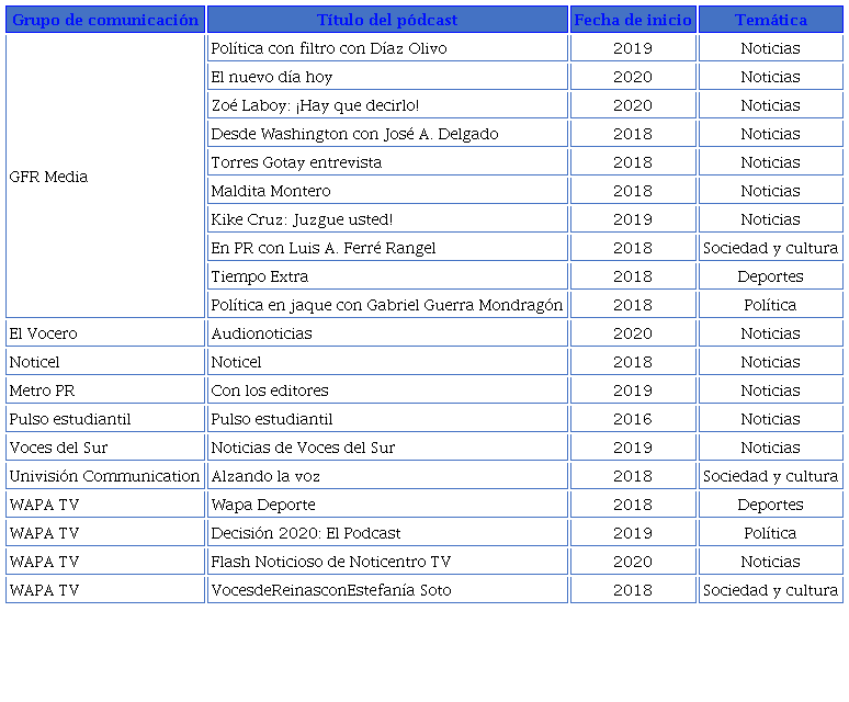 La oferta de pódcast nativos digitales de los medios de Puerto Rico está asociada principalmente a los grupos de prensa. Se trata de 15 pódcast de GFR Media, El Vocero, Noticel, Metro PR, Pulso estudiantil y Voces del Sur. Esta oferta nativa se completa con 5 productos de Univisión Communication (radio) y WAPA TV (televisión) que aplican una estrategia distinta a la programación tradicional. El Nuevo Día, principal periódico del país y propiedad de GFR Media, se distingue de otros medios nacionales, regionales o digitales por contar con 10 pódcast nativos. La tabla 3 lo refleja.