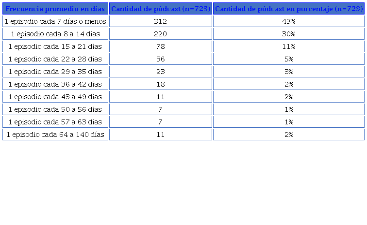 Una vez catalogada la muestra de los pódcast (n=815), se procedió a determinar el número de episodios publicados por cada pódcast dentro del rango de fechas de interés (del 1 de enero de 2020 al 31 de enero de 2021), así como la duración promedio de los episodios y la periodicidad o la frecuencia de publicación. Para calcular el número total de episodios, se tuvo en cuenta la fecha del episodio más antiguo y la fecha del episodio más reciente. Para establecer la duración promedio de los episodios de cada pódcast, se usó la etiqueta <itunes:duration> en los archivos RSS. Las duraciones se sumaron y el resultado se dividió entre el conteo de episodios publicados. Para obtener la periodicidad de publicación de cada uno de los pódcast se dividió los días transcurridos desde la publicación del primer episodio hasta la publicación del último episodio entre la cantidad total de episodios publicados durante los 13 meses contemplados en el período de estudio.