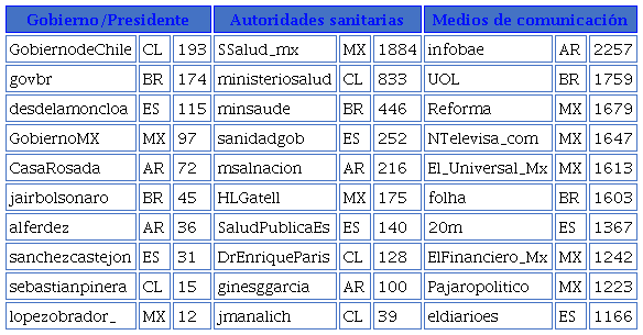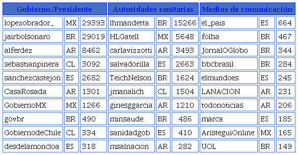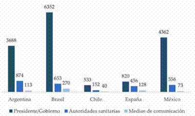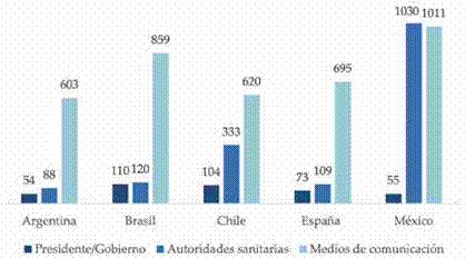 En resumen, los medios de comunicación destacan en Twitter como principales difusores de informaciones y mensajes sobre las vacunas y los procesos de inmunización. En conjunto han publicado una media de 737 de mensajes sobre esta temática durante el periodo analizado, frente a los 270 de las instituciones sanitarias y sus portavoces, y los 70 de las cuentas gubernamentales y los presidentes. Como excepción, las autoridades sanitarias de México y, en menor medida de Chile, han mantenido un nivel de actividad equiparable a la de los medios de comunicación en este aspecto.
