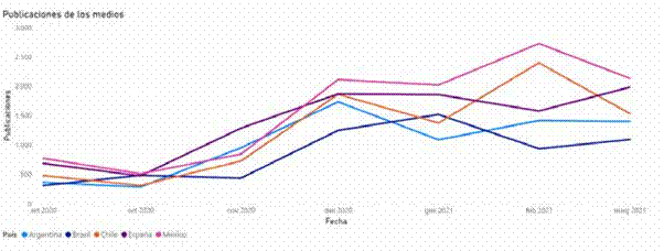 El análisis de la distribución temporal de los mensajes (Figura 2), por su parte, indica un importante incremento en el volumen de mensajes publicados sobre las vacunas con el inicio en el mes de diciembre de las campañas de inmunización en los distintos países, aunque con picos diferenciados en función de la situación del proceso en cada momento.