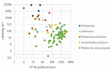 Si relacionamos el volumen de publicaciones y el impacto que logran, podemos identificar cinco tipos de actores en el sistema híbrido en relación a las vacunas. Por un lado, los presidentes difunden un pequeño volumen de mensajes, pero con gran impacto entre las audiencias y la ciudadanía (Figura 4), mientras que los portavoces sanitarios (ministros y portavoces de la pandemia) han desarrollado actividad algo mayor, aunque con un impacto más reducido. En extremo contrario a las fuentes personales nos encontramos a los medios de comunicación, que generan una gran cantidad de mensajes, pero que por término medio obtienen una escasa interacción de las audiencias. Y, en un término medio, las autoridades sanitarias y las cuentas gubernamentales, que generan una cantidad intermedia de información e interacción.