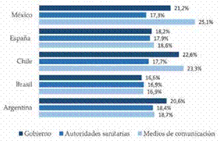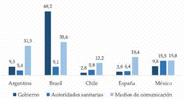 Además, la interacción con las cuentas personales ocurre indistintamente del sentido o de la opinión que manifiesten, como muestra claramente el caso brasileño. Si el presidente Jair Bolsonaro ha publicado mensajes de abierto escepticismo, algunos de sus exministros y las autoridades sanitarias han defendido activamente la vacunación, lo que indica que el engagement resulta útil para medir el grado de controversia, pero no necesariamente su sentido. En relación al nivel de cuestionamiento, las autoridades gubernamentales son las que generan más escepticismo, muy por delante de las autoridades sanitarias y los medios de comunicación.