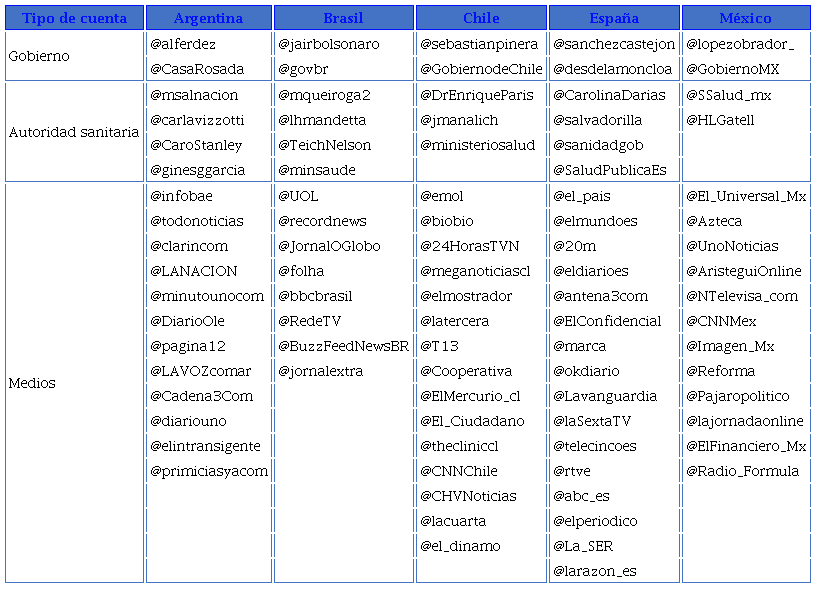 Para realizar el estudio se han tenido en cuenta tres tipos de cuentas en cada uno de los cinco países analizados. En total se han analizado 84 perfiles (Tabla 1).
