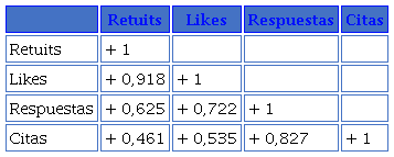 Para calcular el engagement, se han sumado la cifra de retuits, likes, respuestas y citas de cada publicación. Esta operación de suma se ha implementado por la correlación positiva y elevada entre estas cuatro variables (Tabla 2), lo cual sugiere que todas ellas nos sirven para medir un mismo fenómeno que podemos denominar engagement y que es procedente considerar de manera conjunta.