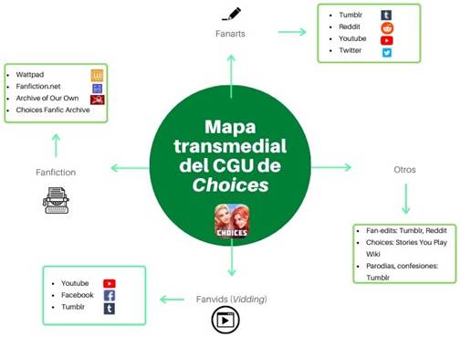 Para el caso de Choices se seleccionaron los fanfiction, fanvids y fanart de dos de las historias de este juego, The Royal Romance (TRR) y EndlessSummer (ES) debido a la cantidad de CGU encontrado hasta abril de 2021. En cuanto a fanfiction, 1946 de TRR y 375 de ES en Archive of Our Own; 73 y 30, respectivamente, en Fanfiction.net; 606 y 105 en Choices Fanfic Archive; y 77 y 32 en Wattpad. En cuanto a fanvids, 18 de TRR y 43 de ES. Los títulos de los fanfiction más relevantes fueron seleccionados de los siguientes sitios web: Archive Of Our Own, ahí se aplicó el filtro de historias con mayor cantidad de “kudos” o felicitaciones (https://bit.ly/31WRn3b https://bit.ly/31UMur5); Fanfiction.net (https://www.fanfiction.net/game/Choices/?&srt=1&r=103&p=2), ahí se tomó en cuenta que la cantidad de comentarios; y Choices Archive Fanfic, ahí también se enfocó en los comentarios (https://choicesfanfic.com/).