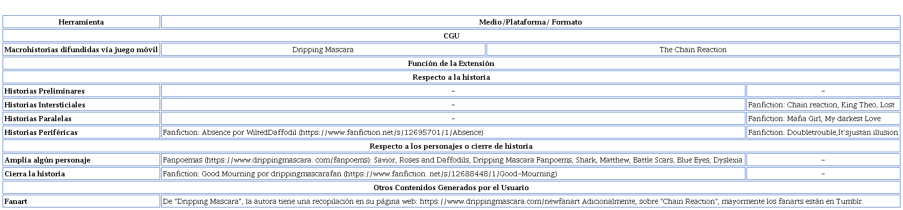 Dada la gran cantidad de contenido generado por los usuarios de estos juegos, se optó por los más representativos. Para el caso del juego móvil Episode, se ha realizado el análisis de CGU desde su plataforma interactiva. Se seleccionaron dos historias: “Dripping Mascara” por su extensión y complejidad de trama, y “Chain Reaction” por ser una de los más leídas. Ambas fueron creadas por los usuarios con las herramientas y tutoriales que propone la plataforma interactiva. Del CGU de “Dripping Mascara” se encontraron 4 fanfiction en Fanfiction.net, 2 en Wattpad y la cuenta empress. will.sail en Instagram con más de 30 poemas; asimismo, la autora Genevieve Marshall tiene una sección dedicada a fanpoemas en la página web de la historia: https://www.drippingmascara.com/ fanpoems. Por otro lado, de “Chain Reaction”, se encontró 7 fanfictions en Wattpad.