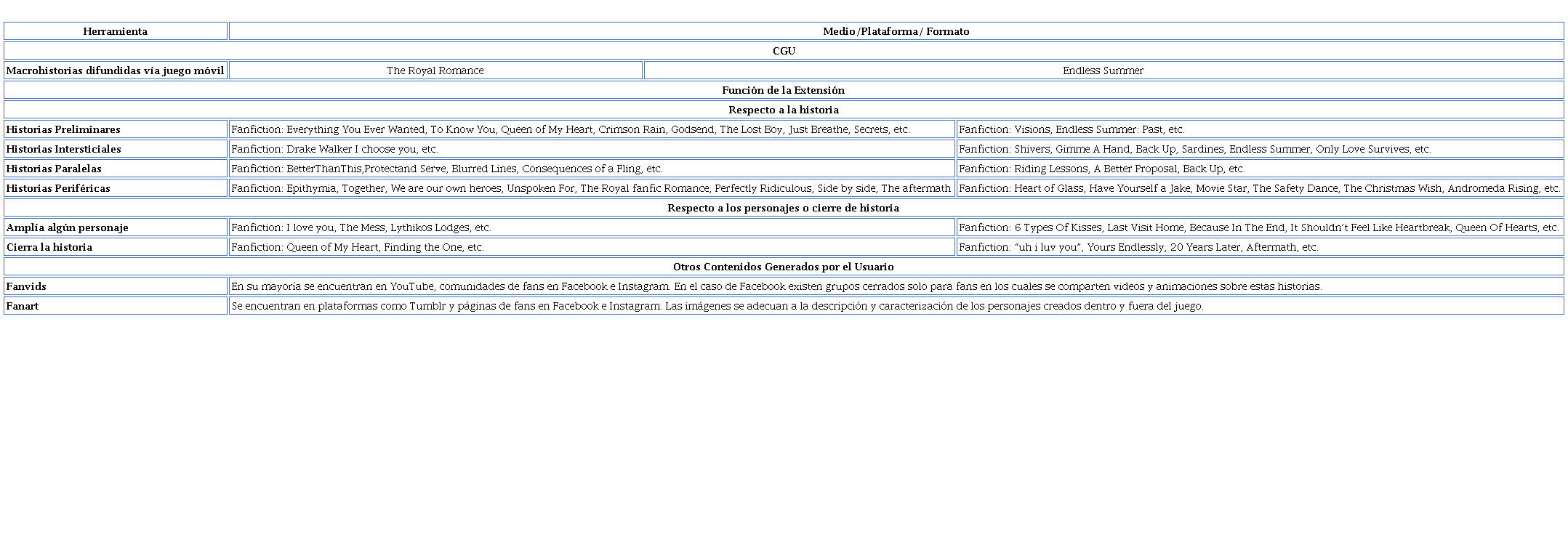 En esta primera parte se reconocieron distintos elementos: la base narrativa del universo transmedia, el soporte en el cual se desarrolla, la audiencia y las partes. Así, tenemos que tanto The Royal Romance (TRR) como Endless Summer (ES) tienen el mismo soporte, ya que son juegos móviles, y la audiencia a la cual son dirigidos son adolescentes. Los juegos giran en gran medida en las decisiones tomadas, las cuales pueden mejorar o disminuir las relaciones con los otros personajes y, en consecuencia, alterar la secuencia de algunos hechos. También ambos se desarrollan en la actualidad y tienen protagonistas cuya apariencia y nombre pueden ser modificados al gusto del usuario.