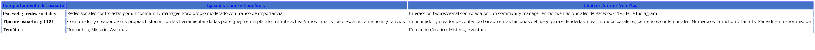 Por la comparación, se puede apreciar que ambos juegos, si bien tienen similitudes, suscitan un comportamiento ampliamente diferenciable entre sus usuarios. Los dos juegos móviles cuentan con historias propias populares. La diferencia radica en que Episode, debido a la posibilidad de los usuarios de convertirse en creadores de sus propios relatos, no tienen inclinación a escribir fanfiction basado en otras historias. A su vez, esto incentiva que haya un gran volumen de interacción entre los usuarios creadores en el foro oficial, donde se ayudan entre ellos facilitándose mutuamente ayudas visuales, tutoriales y gráficos.