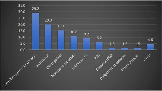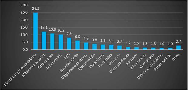 Ahora bien, en tercer lugar, se ubicaron las autoridades de otros países (15,4%), mientras que el Ministerio de Salud de la Nación ocupó el cuarto lugar (10,8%), bastante por delante del resto de los funcionarios del PEN, incluido el Presidente (6,2). Los laboratorios, protagonistas centrales de la problemática, acapararon el quinto lugar (9,2%). Por último, el Ejecutivo de la Provincia de Buenos Aires, los dirigentes de la oposición y el Poder Judicial obtuvieron una presencia marginal (1,5% cada uno de ellos).