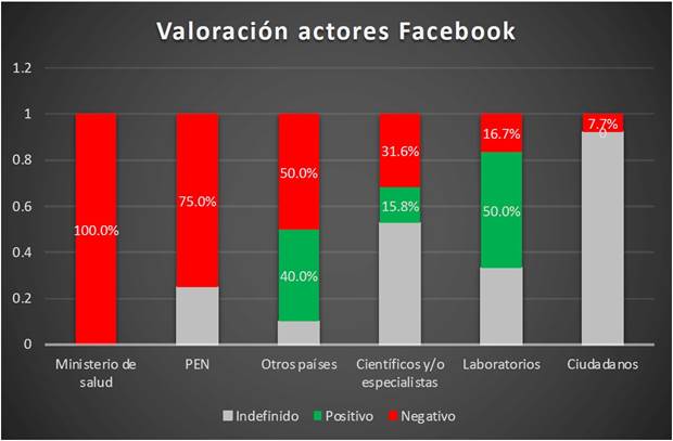 En tanto, es de destacar que los científicos y/o especialistas aparecen valorados la mayor parte de las veces también de manera negativa. El fenómeno se explica por la alta frecuencia que obtuvieron en esta plataforma noticias relativas a los riesgos asociados a las vacunas y a las dudas respecto de su eficacia. En tanto, los laboratorios, especialmente los estadounidenses, son los únicos que adquirieron una valoración predominantemente positiva en los posteos informativos. Asimismo, científicos, en menor medida, y laboratorios fueron los únicos actores a los que se les atribuyó la responsabilidad por aliviar la situación en un contexto en el que fueron los problemas y no las soluciones las que adquirieron mayor relevancia a partir del nivel de involucramiento de los usuarios.