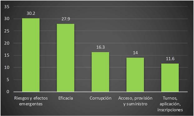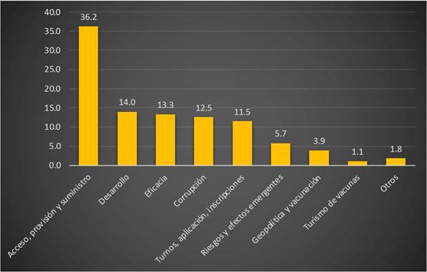 La corrupción asociada a las vacunas ocupó el tercer lugar (16,3%). En tanto, la discusión sobre el acceso, la provisión y el suministro, principal asunto jerarquizado por los medios, aparece cuarta entre las preocupaciones ciudadanas en la red (14%). Finalmente, noticias relacionadas con el proceso de vacunación, principalmente referidas a la gestión de turnos e información sobre franjas etarias habilitadas se ubicaron en quinto lugar (11,6%).