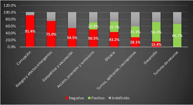 En el mismo sentido, la alarma mediática sobre los efectos secundarios o riesgos de las vacunas también acaparó un nivel importante de valencia negativa, del mismo modo que sucedió con la discusión geopolítica, las negociaciones del gobierno por las vacunas y las gestiones desarrolladas para lograr acceder a los fármacos. Sobre este último asunto, la valoración negativa sobre el acceso a un bien escaso en cinco de cada diez noticias contrasta con el tono positivo en sólo dos de cada diez, en un contexto en el que la Argentina se ubica dentro del bloque de países latinoamericanos que mayor cantidad de vacunas recibió y aplicó.