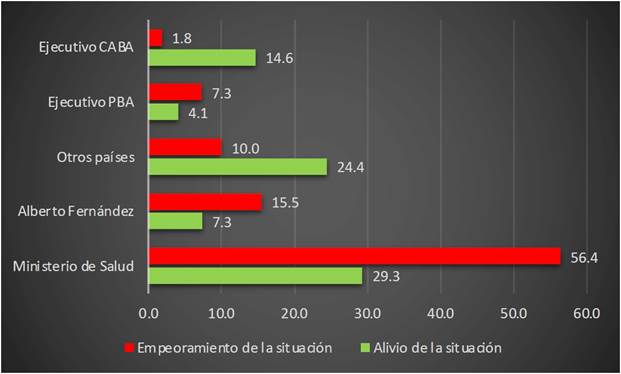 El análisis de la atribución de responsabilidad desplegado en el gráfico 6 expresa que el Ministerio de Salud fue sindicado más veces como responsable por el empeoramiento de la situación que por su alivio. Lo mismo sucedió con la figura del presidente de la Nación, Alberto Fernández, y con el Gobierno de la Provincia de Buenos Aires.